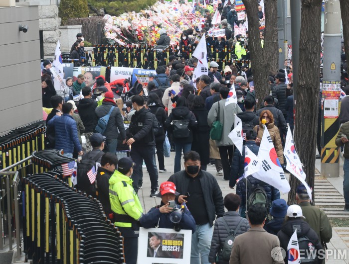 [서울=뉴스핌] 양윤모 기자 = 윤석열 대통령 탄핵심판 선고를 앞두고 12일 오후 서울 종로구 헌법재판소 앞에서 윤 대통령 지지자들이 탄핵을 반대하는 집회를 하고 있다. 2025.03.12 yym58@newspim.com