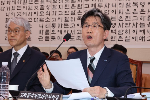 오 처장은 “저희들은 법원에서 정당하게 발부한 체포·구속영장에 대해 적법절차의 원칙에서 한 치의 어긋남도 없이, 법원의 명령장이기도 한 체포·구속영장을 명령대로 이행했다”며 “그런 업무를 수행한 공수처가 내란의 주체라 하니 도대체 신성한 국회에서, 공수처라는 정부 기관이 일하는 것에 대해 그렇게 모독할 수 있느냐”며 언성을 높였다.