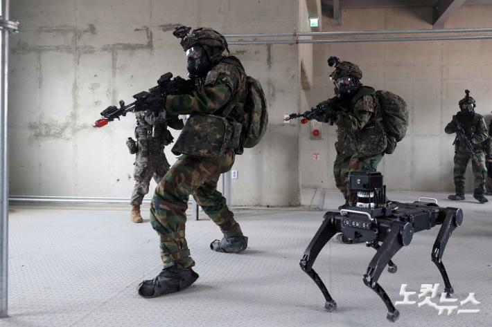 12일 경기 파주시 무건리 훈련장에서 2025 FS/TIGER 일환으로 실시된 유무인 복합전투체계 활용 '한미연합 WMD(대량살상무기) 제거훈련'에서 25사단 장병들이 시설을 정찰 및 확보하고 있다.