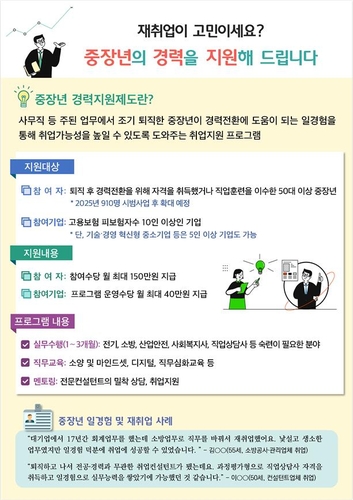 중장년 경력지원제는 50대 중장년이 기존 사업장에서 퇴직하고 새로운 경력을 쌓아 재취업하길 희망하는 경우 경력전환형 일경험 기회를 제공하는 사업이다.