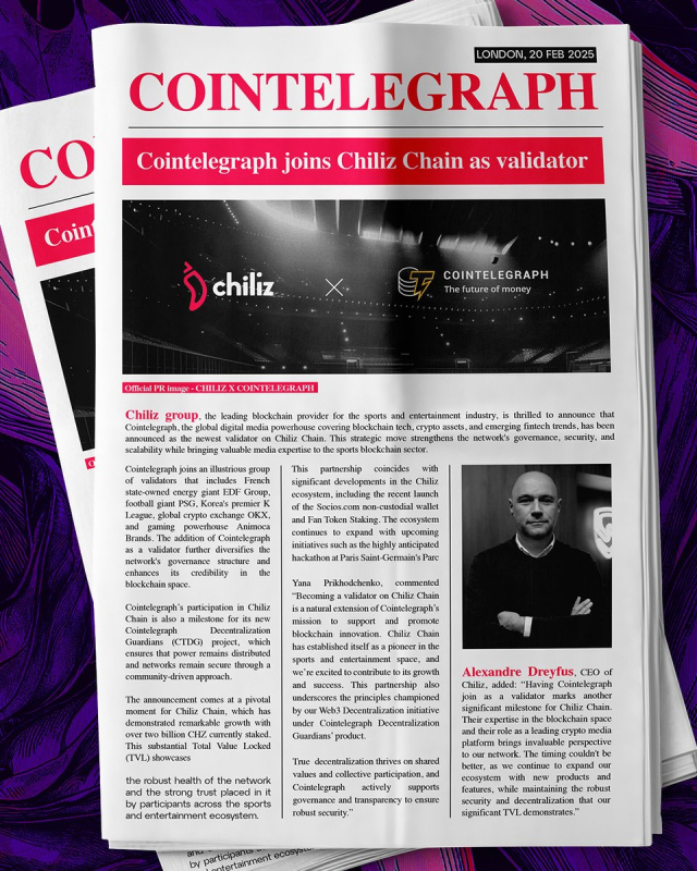 코인텔레그래프는 암호화폐 및 블록체인 업계를 대표하는 글로벌 미디어로, 단순한 뉴스 제공을 넘어 블록체인 생태계의 지속가능성을 높이는 전략을 추진하고 있다. 이번 칠리즈 체인의 검증인 합류를 계기로, 블록체인 기술의 확산과 스포츠·엔터테인먼트 산업과의 접목을 더욱 적극적으로 알릴 계획이다.