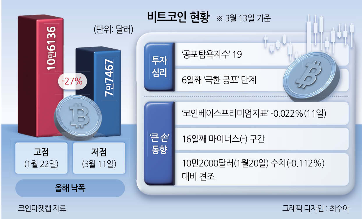 ▶비트코인 -27%…‘큰 손’ 지표는 견조 =13일 코인마켓캡에 따르면 비트코인은 올 들어 -27% 낙폭을 기록했다. 지난 1월 22일 10만6136달러를 고점을 찍고 지난 11일 7만7467달러까지 떨어졌다.
