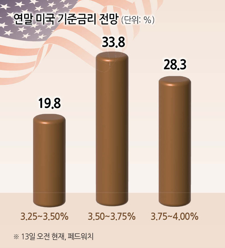 13일 오전 시카고상품거래소(CME) 페드워치에 따르면 금리 선물시장은 오는 12월 10일까지 미국 기준금리가 현재의 4.25%~4.50%에서 3.50~3.75%까지 내려갈 확률을 33.8%로 반영했다. 금리를 한 번에 0.50% 내리는 ‘빅컷’이 없다고 가정하면 3회 인하된다는 뜻이다. 한 달 전까지만 해도 이 확률은 6.3%에 불과했다. 심지어 금리를 4번 내릴 수 있단 가능성도 19.8%로 나타났다.