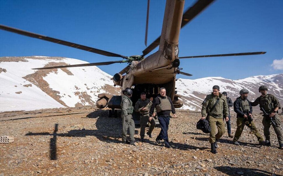11일(현지시각) 이스라엘 카츠(가운데) 이스라엘 국방부 장관이 헤르몬산 정상에 헬기를 타고 내리고 있다. 타임스오브이스라엘 갈무리 |