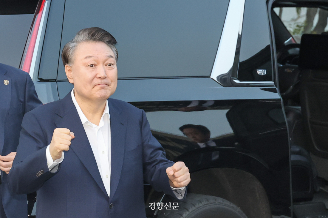 법원의 ‘구속 취소’ 결정에 석방된 윤석열 대통령이 지난 8일 오후 서울 용산구 한남동의 대통령 관저 인근에 도착해 경호 차량에서 내려 지지자들과 인사하고 있다. 이준헌 기자 |