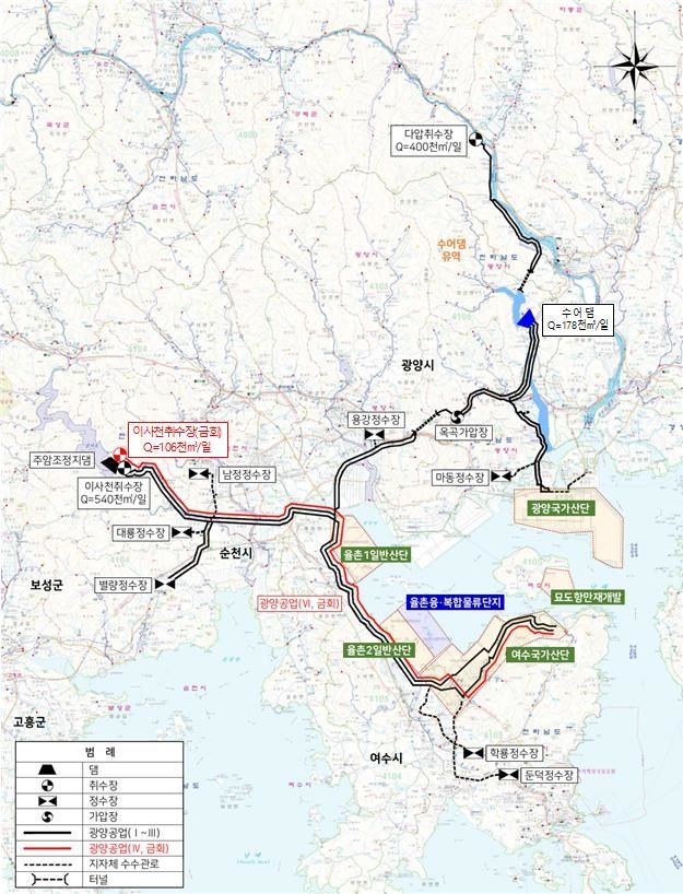 전남도에 따르면 이번 사업은 여수·광양만권 산업단지에 안정적 공업용수를 공급하기 위해 하루 10만6000t의 공업용수를 추가 공급하는 것을 목표로 신규 광역상수도를 개발하는 것이다. 총사업비는 2128억원, 사업 기간은 오는 2032년까지다.