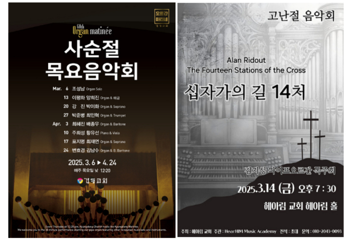 이밖에 꾸준히 오르간 연주회를 열고 있는 남대문교회(서울 중구)는 오는 27일을 시작으로 다음 달 24일, 5월 16일 저녁에 정기연주회를, 다음 달 9일과 6월 5일 수요일 낮 정오음악회를 개최한다.