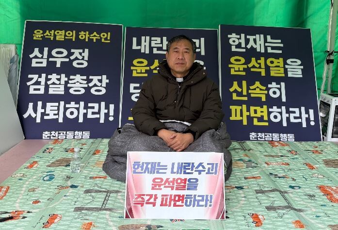 민주주의와 민생, 사회 공공성 실현을 위한 춘천공동행동은 13일 오전 강원도 춘천시 거두사거리에서 기자회견을 열고 “지성희 신부가 말이 아닌 몸으로, 목소리가 아닌 침묵으로 민주주의와 헌정 질서 회복을 위한 결연한 의지를 표현하며 투쟁에 돌입했다”고 밝혔다. 지성희 신부가 침묵 단식 농성을 시작한 것은 지난 12일 저녁부터로 윤 대통령 파면 때까지 무기한으로 이어진다.