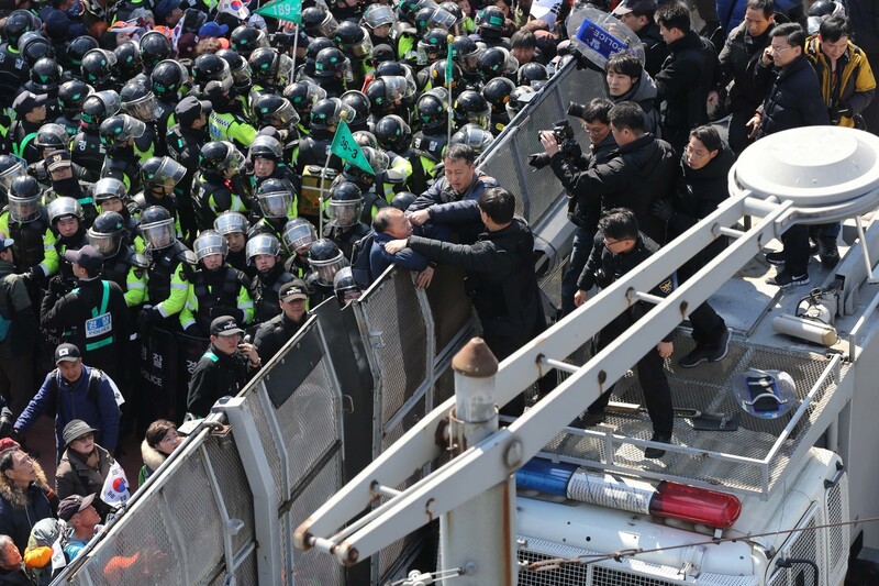 헌법재판소의 박근혜 전 대통령 탄핵인용이 발표된 2017년 3월10일 오전 대통령 탄핵에 반대하던 시민들이 경찰의 저지선을 뚫고 서울 재동 헌재로 향하고 있다. 박종식 기자 anaki@hani.co.kr |