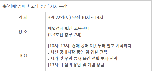 매경 부동산센터는 내 주 3월 22일(토) 오전 10시부터 오후 1시 30분까지 ‘경매·공매 최고의 수업’(매경출판) 저자 특강을 진행한다.