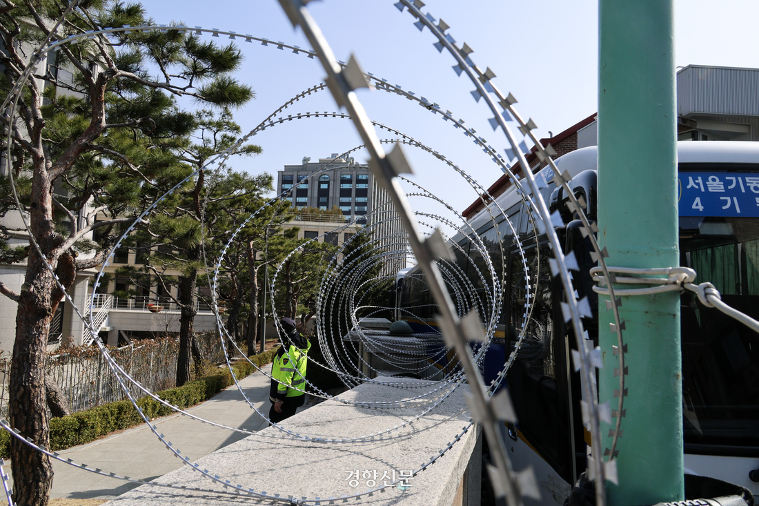 14일 서울 종로구 헌법재판소 담장에 철조망이 설치돼있다. 2025.3.14 이준헌 기자 |