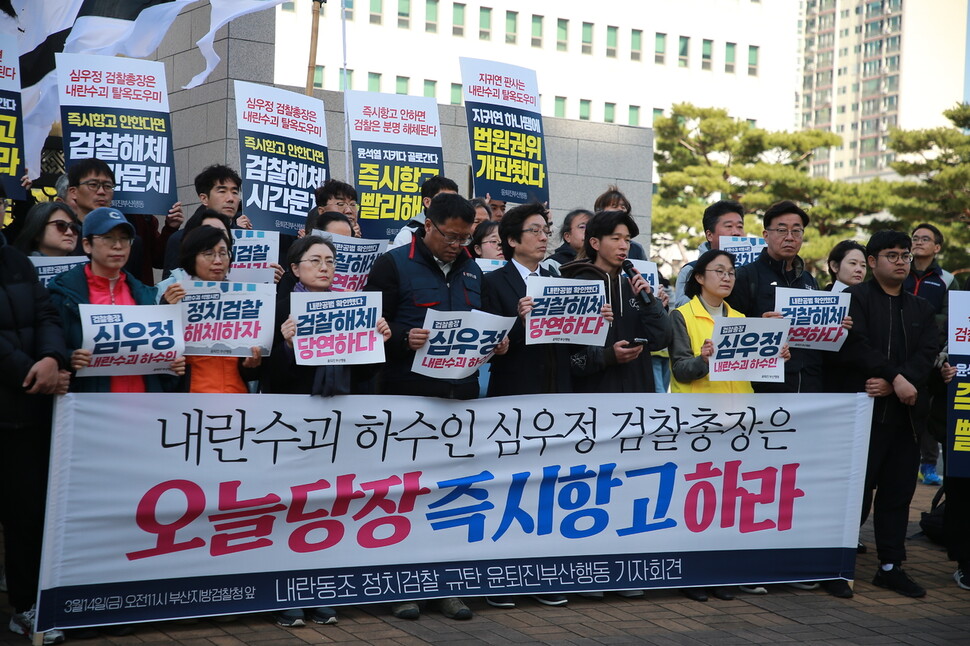 부산 시민사회단체 100여곳으로 이뤄진 ‘윤석열 즉각퇴진 사회대개혁 부산비상행동’은 14일 부산 연제구 거제동의 부산지검 앞에서 기자회견을 열어 “그나마 남아 있는 검찰의 명예를 지키려면, 심우정 검찰총장은 윤석열 대통령 구속 취소 결정에 즉시항고하라”고 밝혔다.