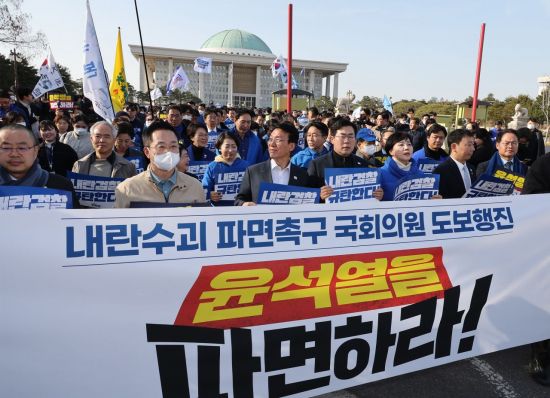 박찬대 민주당 원내대표, 김선민 조국혁신당 권한대행, 임명희 사회민주당 부대표와 야당 의원들은 이날 오후 서울 여의도 국회에서 '내란수괴 윤석열 파면'을 촉구하며 광화문을 향해 도보 행진을 하고 있다.