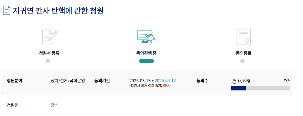 이 청원을 보면, 청원인들은 서울중앙지법 형사합의25부 재판장인 지귀연 부장판사의 탄핵이 필요하다고 주장했다. 지 부장판사가 속한 이 재판부는 지난 7일 윤 대통령 측의 윤 대통령 구속 취소 청구를 인용했다.