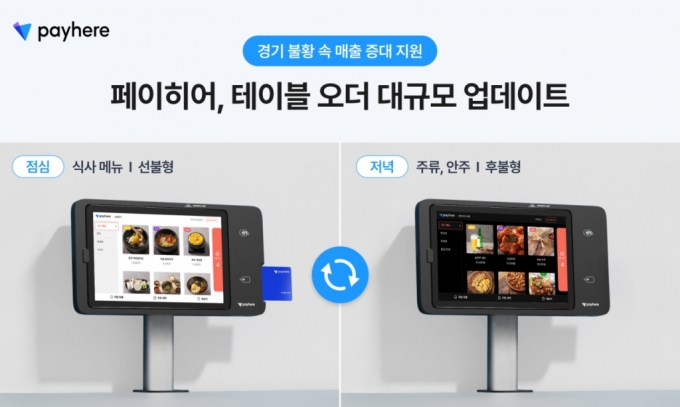 페이히어 관계자는 "경기 불황으로 낮에는 식당, 밤에는 주점 등 다르게 장사하는 매장을 위해 테이블 오더 메뉴가 자동 변경되는 기능이 적용됐다. 단품 메뉴는 선불형, 추가 주문이 많은 메뉴는 후불형 등 주문 특성에 따라 결제도 자유롭게 전환할 수 있다"고 했다.