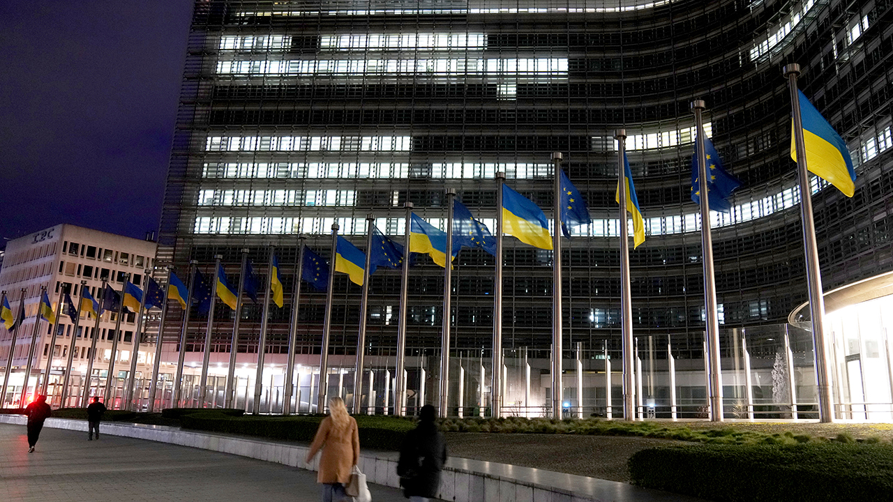▲ 브뤼셀 EU 본부의 유럽연합과 우크라이나 국기