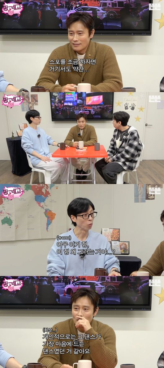 "춤을 안 배웠으니까 그런 모습이 나오는 것"이라고 너스레를 떤 그를 향해 유재석은 "가만 보면 병헌이 형이 마음이 약하다"라며 감쌌다. 이에 이병헌은 "그래서 '밈'이라는 것들이 홍수다. 우리 아들한테는 내 영화를 보여준 게 작년에 처음이었다. 내 특별전을 해서 하루에 한 영화씩 일주일 동안 보여주는 영화제가 있었다. 처음으로 '광해'를 보여줬다. 그 전까진 유튜브 밈스타인 줄 알았을 것"이라고 너스레를 떨었다.