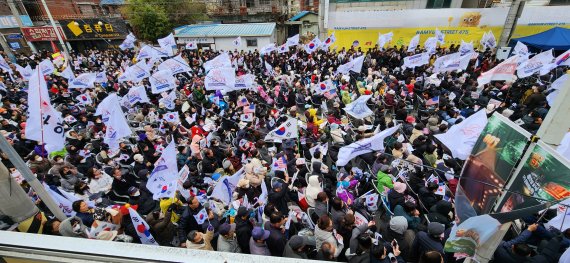 세이브코리아 주최 '국가비상기도회'가 열리는 경북 구미역 앞에 1만여명이 운집해 윤석열 탄핵 반대 목소리를 높이고 있다. 김장욱 기자 |