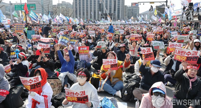 [서울=뉴스핌] 김학선 기자 = 15일 서울 종로구 광화문 동십자각 앞에서 열린 야5당 공동 비상시국 대응을 위한 범국민대회에서 참석자들이 구호를 외치고 있다. 2025.03.15 yooksa@newspim.com