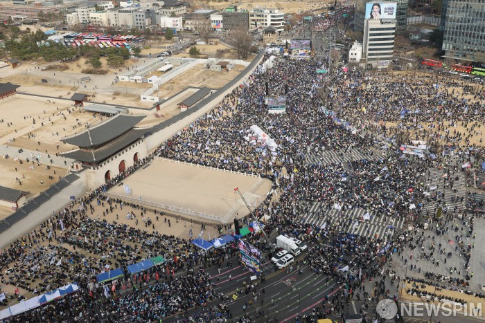 [서울=뉴스핌] 김학선 기자 = 윤석열 대통령 탄핵에 찬성하는 측인 '윤석열즉각퇴진·사회대개혁 비상행동(비상행동)'이 15일 오후 서울 광화문 동십자각 일대에서 15차 범시민대행진을 개최, 윤 대통령의 파면을 촉구하고 있다. 2025.03.15 yooksa@newspim.com