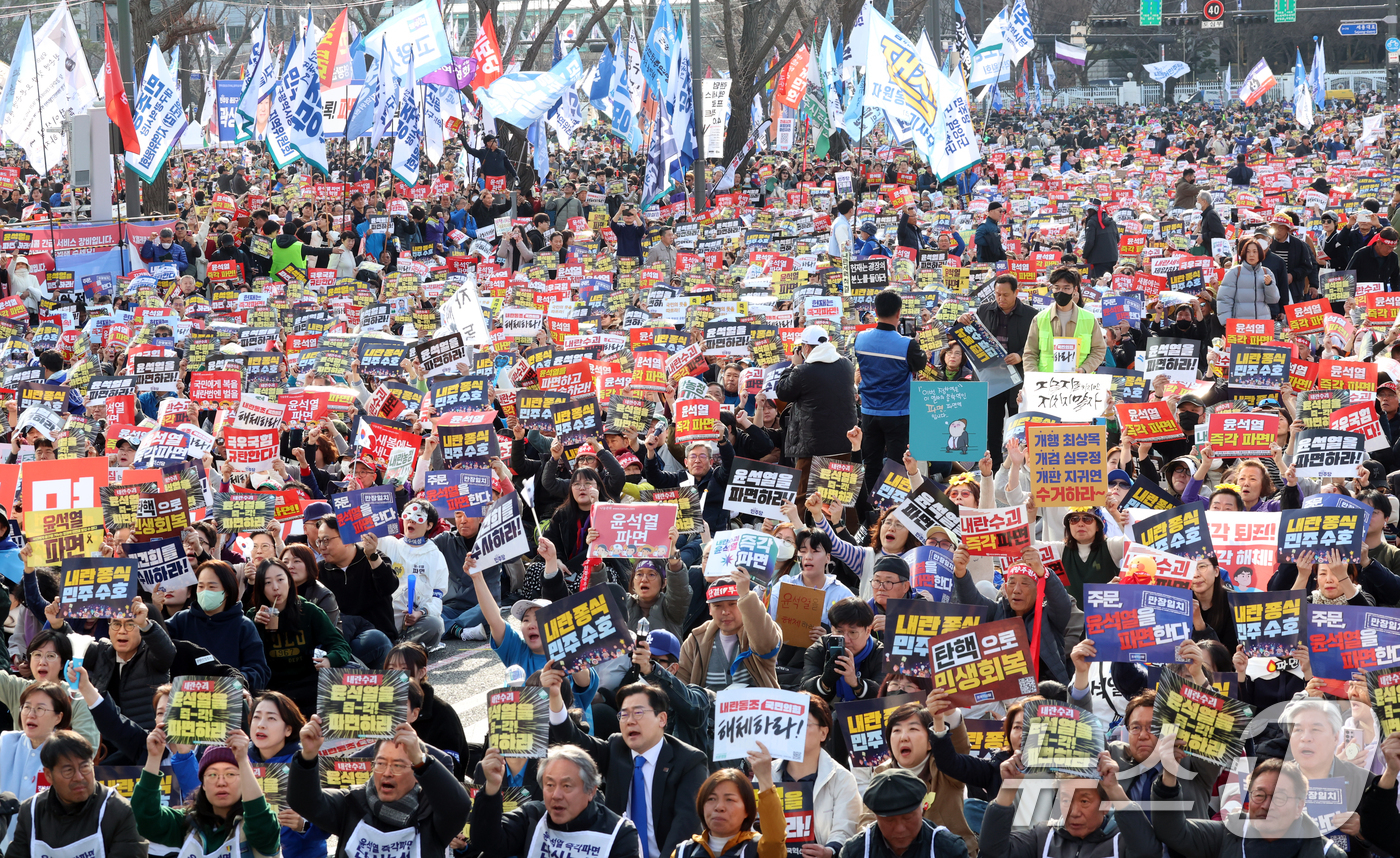 (서울=뉴스1) 김명섭 기자 = 15일 서울 종로구 사직로에서 열린 '윤석열즉각퇴진·사회대개혁 비상행동 대행진'에서 참가자들이 피켓을 들고 구호를 외치고 있다. 2025.3.15/뉴스1