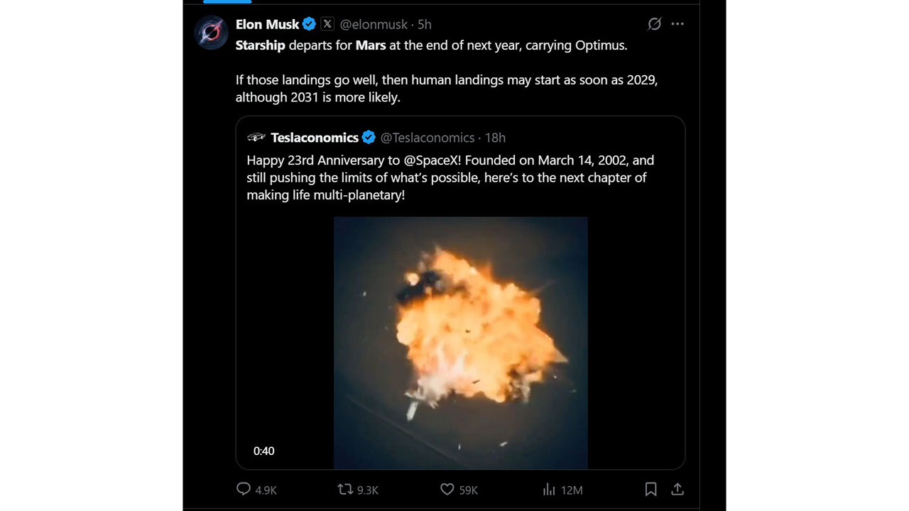 ▲ 일론 머스크가 올린 화성행 스타십 발사 계획 게시물