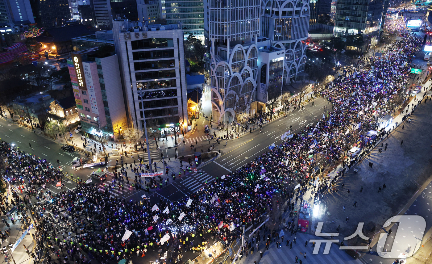 (서울=뉴스1) 김명섭 기자 = 15일 서울 종로구 사직로에서 열린 '윤석열즉각퇴진·사회대개혁 비상행동 대행진'에서 참가자들이 구호를 외치며 행진하고 있다. 2025.3.15/뉴스1