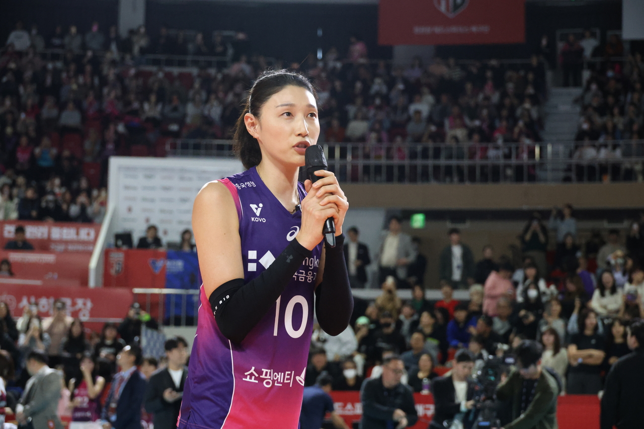 김연경은 15일 인천 삼산월드체육관에서 열린 한국도로공사와 홈경기 후 도로공사 선수단이 마련해준 조촐한 은퇴 행사에 참여했다.