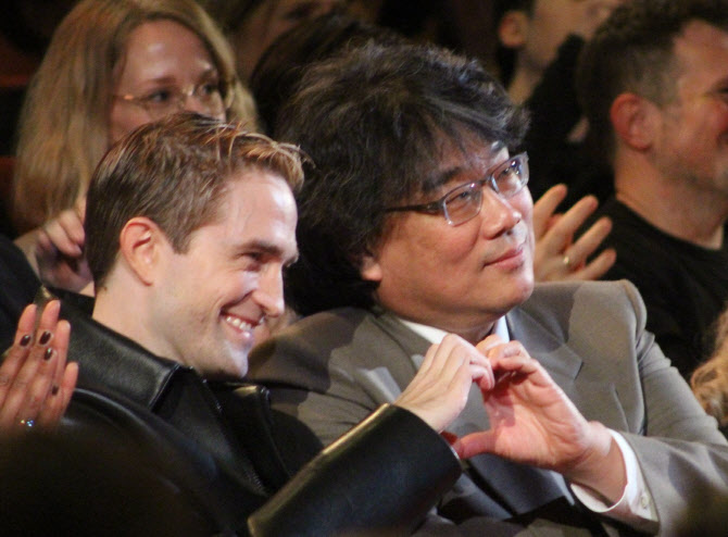 포즈 취하는 봉준호 감독과 로버트 패틴슨(사진=연합뉴스) |