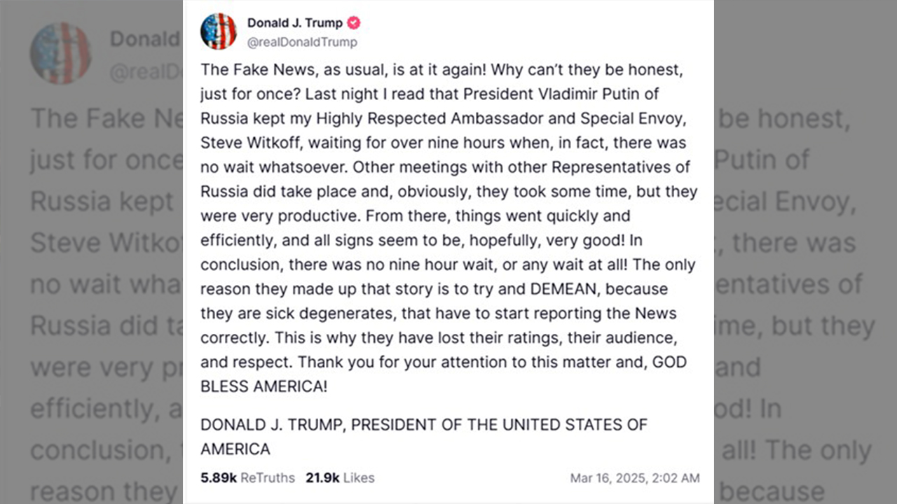 그는 "러시아의 블라디미르 푸틴 대통령이 내가 보낸 매우 존경받는 대사 겸 특사 스티브 위트코프를 9시간 넘게 기다리게 했다고 (보도한 기사를) 간밤에 읽었다"며 "실제로는 기다린 시간이 아예 없었다"고 주장했습니다.