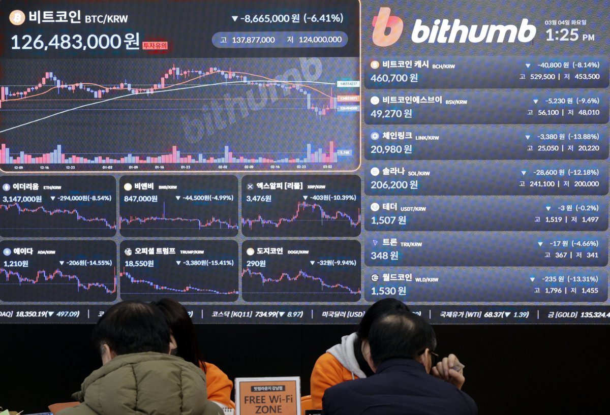 이달 4일 서울 서초구 빗썸 투자자보호센터에 비트코인이 ‘미국 관세 리스크’ 영향으로 하락해 1억2600만원대에 거래되고 있다. 뉴시스 |