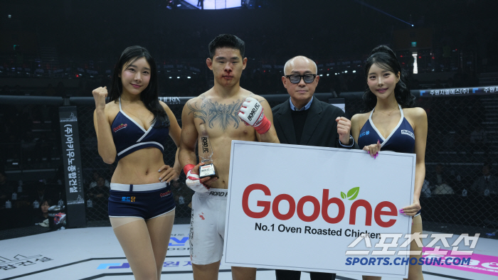 굽네치킨 중국지사 김영철 대표가 16일 서울 장충체육관에서 열린 ROAD FC 072 -67㎏ 계약체중 매치에서 승리한 박현빈에게 트로피를 시상한 뒤 기념촬영을 하고 있다. 사진제공=로드FC