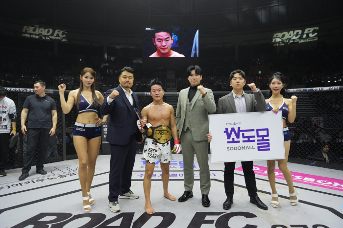 로드FC 서덕호 대표, 소도몰 강태구 본부장, 손용석 본부장이 16일 서울 장충체육관에서 열린 굽네 ROAD FC 072 플라이급 타이틀전에서 승리한 이정현에게 트로피를 시상한 뒤 기념촬영을 하고 있다. 사진제공=로드FC