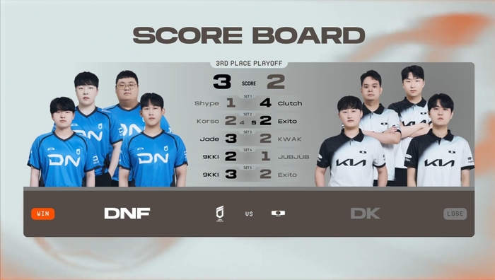 DNF는 16일 서울 잠실DN콜로세움에서 열린 2025 FTB 스프링 3·4위전서 디플러스 기아에 3-2 이겼다. 1,2세트를 내주며 출발한 DNF는 이현민이 곽준혁을 꺾으며 추격했다. ‘에이스’ 김시경이 4,5세트서 승리하며 3위를 차지했다.
