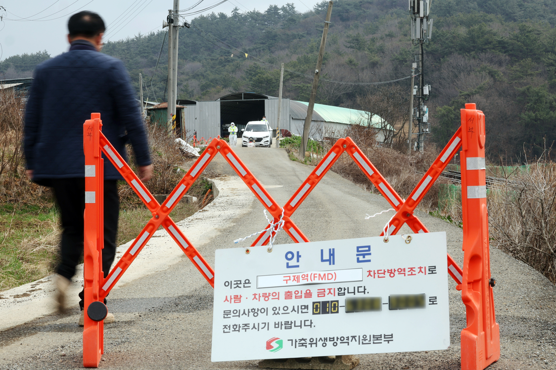 16일 낮 구제역이 발생한 전남 무안군 한 한우농장 앞에서 방역본부 관계자가 출입 통제 안내판 너머로 이동하고 있다. 전남 지역에서는 영암·무안 등 5개 농장이 구제역 양성 판정을 받았다. 연합뉴스 |