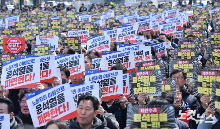 윤석열즉각퇴진·사회대개혁비상행동이 17일 오후 서울 종로구 광화문 광장에서 열린 윤석열 즉각 파면 촉구 각계 긴급시국선언 기자회견에서 구호를 외치고 있다.