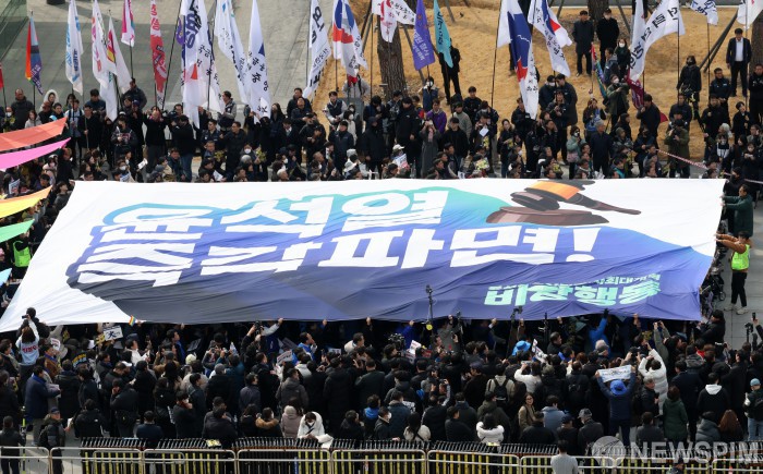 [서울=뉴스핌] 정일구 기자 = 윤석열즉각퇴진·사회대개혁비상행동 등 관계자들이 17일 오후 서울 종로구 광화문광장에서 열린 윤석열 즉각 파면 촉구 각계 긴급시국선언 기자회견에서 대형 현수막 퍼포먼스를 하고 있다. 2025.03.17 mironj19@newspim.com