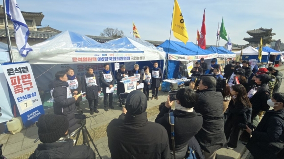 ‘윤석열탄핵 야 5당 국회의원연대 광화문 광장 단식농성단’( 이하 탄핵연대 단식농성단 )은 17일 오전광화문 농성장에서 기자회견을 열고 헌법재판소의 탄핵 심판 선고를 촉구했다. 단식농성단에는 더불어민주당 박수현·위성곤·민형배·서영석·김준혁 , 진보당 윤종오 의원이 참여하고 있다.