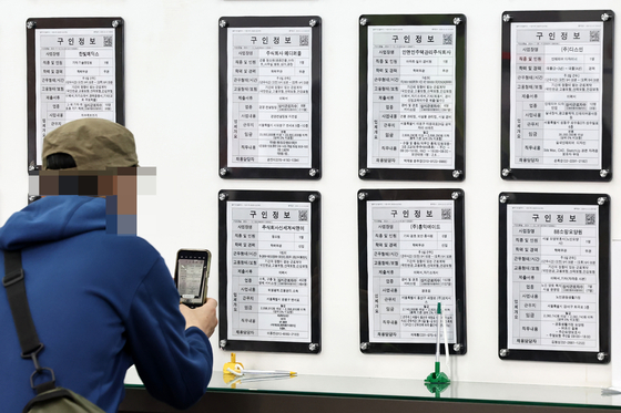 서울 마포구 서부고용복지플러스센터에서 한 구직자가 일자리 정보 게시판 속 구인업체 정보를 휴대전화 카메라에 담고 있다. 뉴스1 |