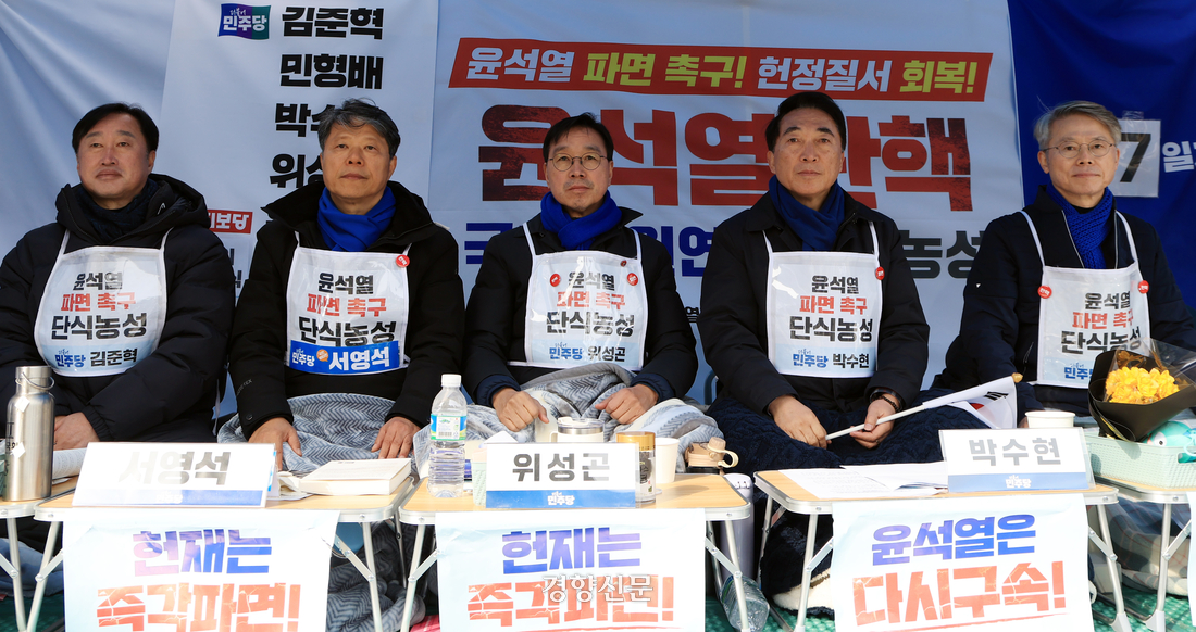 윤석열탄핵국회의원연대(탄핵연대) 소속 야당 의원 7명이 헌법재판소에 윤석열 대통령 파면을 촉구하며 단식에 돌입한 지 17일로 일주일째를 맞았다. 김준혁·박수현·위성곤·민형배·서영석·강득구 더불어민주당 의원과 윤종오 진보당 원내대표 등이다.