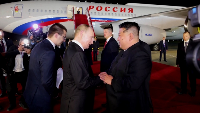 김정은 북한 국무위원장이 지난 19일 평양 국제공항에서 평양을 방문일정을 마친 블라디마르 푸틴 러시아 대통령을 환송 했다고 조선중앙TV가 20일 보도했다. /사진=뉴시스(조선중앙TV 갈무리) |