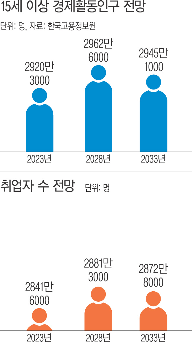 저출생·고령화가 가팔라지면서 경제활동인구가 2030년부터, 취업자 수는 2029년부터 감소할 것이라는 전망이 나왔다. 2033년까지 82만명가량의 추가 인력이 필요할 것으로 예상된다.