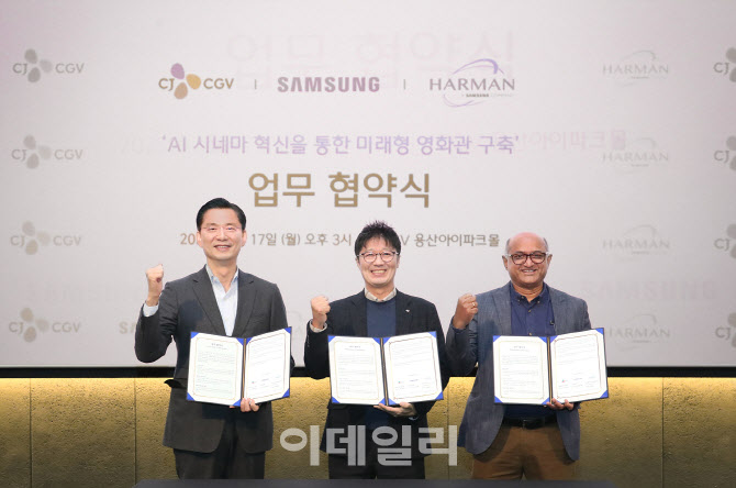 삼성전자와 하만, CJ CGV가 17일 ‘AI 시네마 혁신(AI Cinema Innovation)을 통한 미래형 영화관 구축’에 대한 전략적 업무협약식을 진행했다. (왼쪽부터)삼성전자 한국총괄 임성택 부사장, CJ CGV 정종민 대표이사, 하만 아시아태평양 및 인도 총괄 아마르 수바시(Amar Subash) 부사장. (사진=삼성전자) |