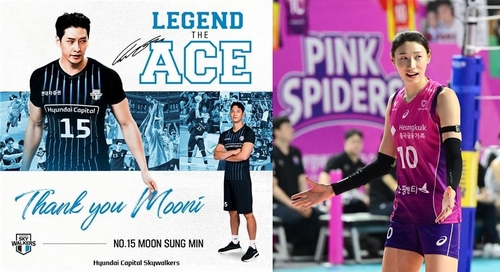 (서울=연합뉴스) 이동칠 기자 = 올 시즌을 끝으로 코트를 떠나는 '배구 전설' 문성민(39·현대캐피탈)과 김연경(37·흥국생명)이 20일 정규리그 최종전에서 '고별인사'를 한다.