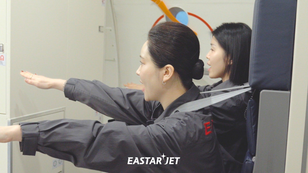 이스타항공 승무원들이 기내에서 비상 탈출 훈련을 진행하고 있다. |