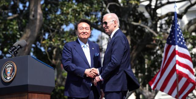 2023년 4월 26일 미국을 국빈 자격으로 방문한 윤석열 대통령이 워싱턴 백악관에서 열린 공식 환영식에 참석해 조 바이든 당시 미 대통령과 악수하고 있다. 워싱턴=연합뉴스 |