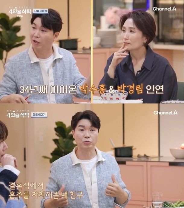 박수홍은 17일 방송된 채널A '절친 도큐멘터리 - 4인용식탁' 다음주 예고편에서 "박경림이 나 결혼할 때 개량한복 입고 혼주석에 서줬다"며 이렇게 밝혔다.