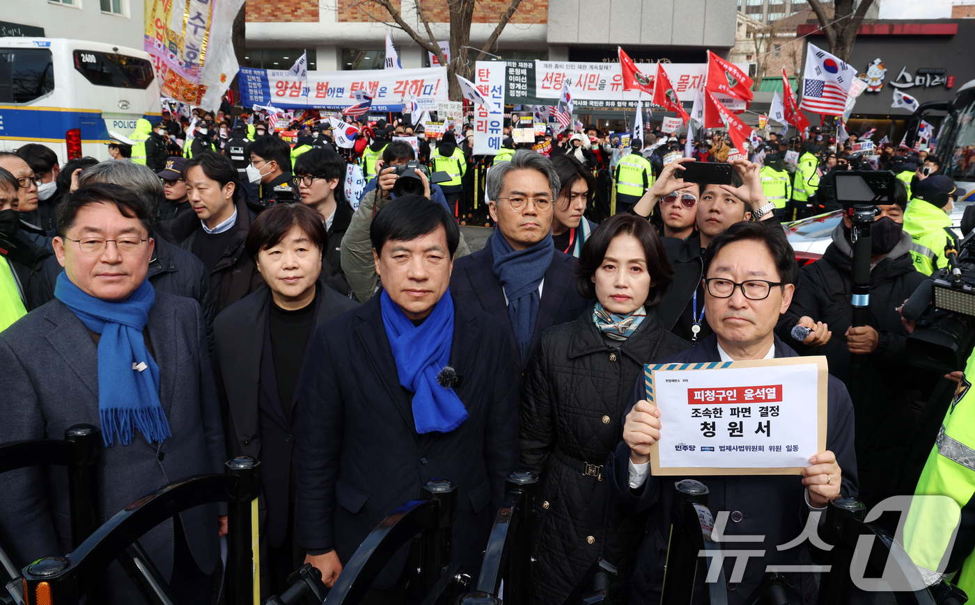 (서울=뉴스1) 김명섭 기자 = 국회 법사위 야당 위원들이 18일 오후 서울 종로구 헌법재판소에서 피청구인 윤석열 파면 촉구 기자회견을 마치고 청원서를 접수하려 하고 있다. 한편 이날 기자회견 동안 뒤쪽 윤석열 대통령 지지자들이 야유를 보내고 있다. 2025.3.18/뉴스1