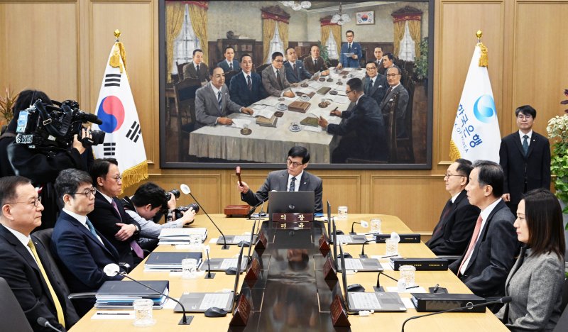 이창용 한국은행 총재(가운데)가 지난달 25일 서울 중구 한은 본관에서 열린 금융통화위원회 개회를 선언하며 의사봉을 두드리고 있다. 금통위는 이날 기준금리를 기존 3.00%에서 2.75%로 0.25%p 내렸다. 연합뉴스 |