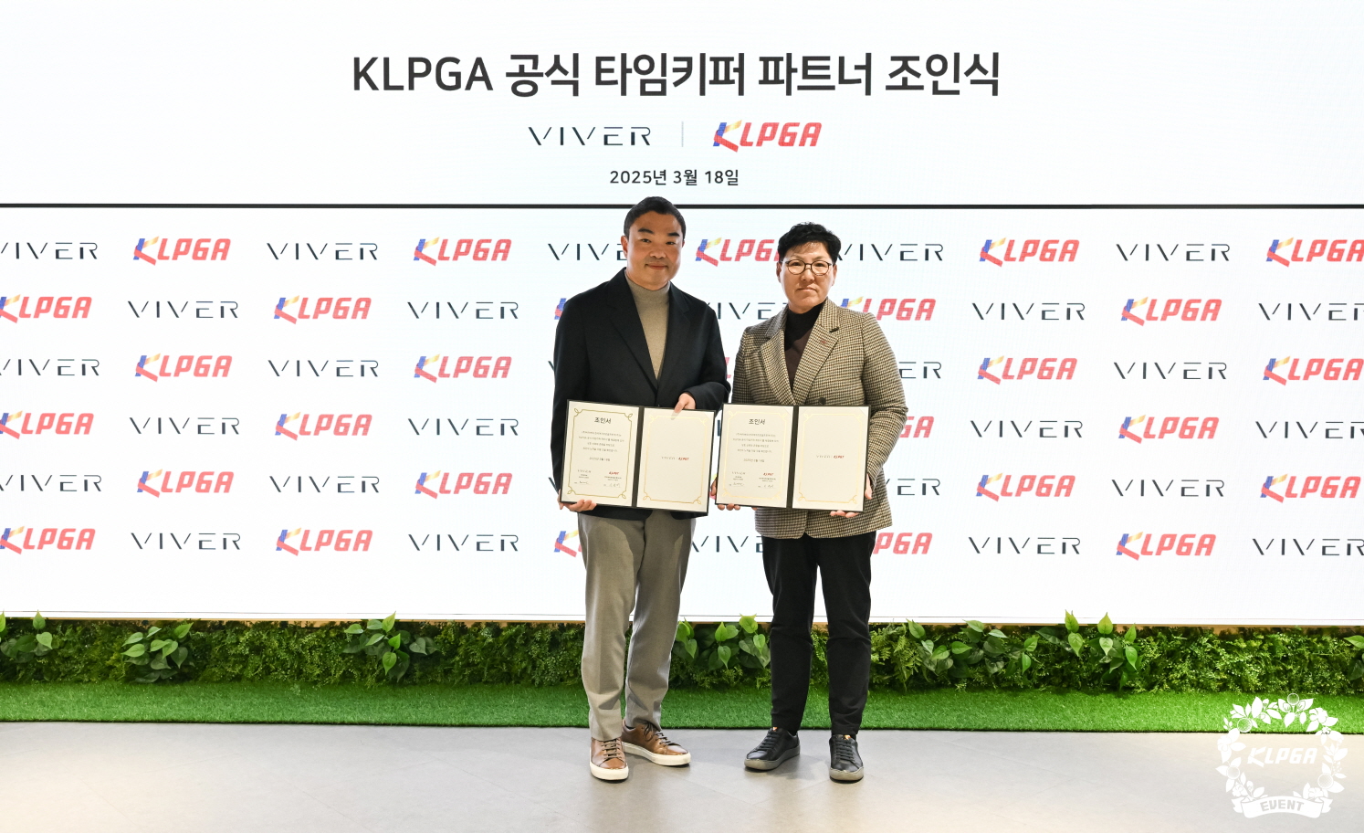 한국여자프로골프투어(이하 KLPGT)는 18일 바이버와 KLPGA 공식 타임키퍼 파트너 체결 조인식을 진행했다. 이날 조인식에는 바이버 문제연 대표이사와 KLPGT 이영미 대표이사가 참석했다.